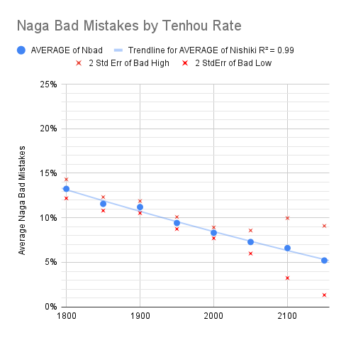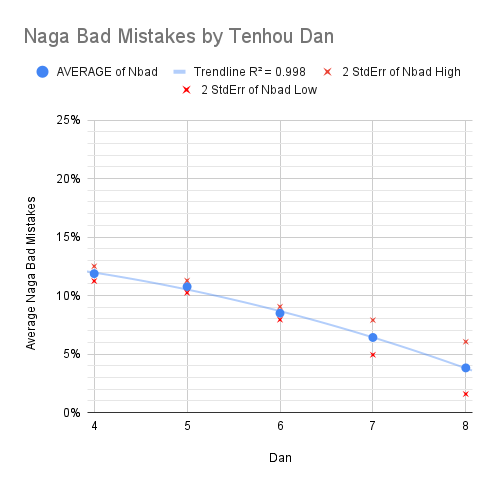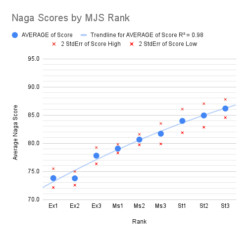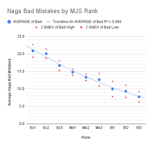 Here are individual charts for MJS and Tenhou, starting with MJS. The Red Xs above and below each datapoint shows a +/- 2 Standard Error range. The blue line is a 2nd degree polynomial fit.