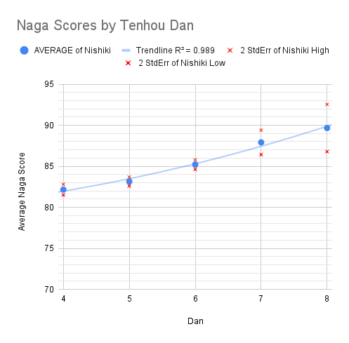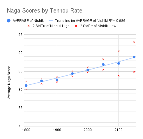 Here are individual charts for MJS and Tenhou, starting with MJS. The Red Xs above and below each datapoint shows a +/- 2 Standard Error range. The blue line is a 2nd degree polynomial fit.