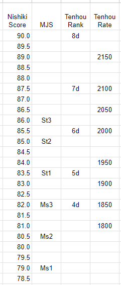 To start with the conclusion, this chart shows each MJS rank, Tenhou dan rank, and Tenhou Rating bin and their average Nikishi score.